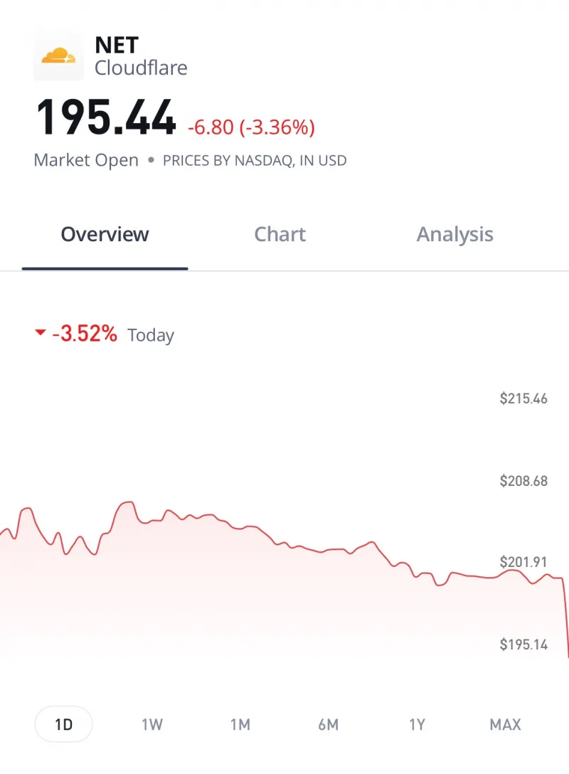 News of the outage had immediate financial repercussions for Cloudflare. The company’s stock (ticker NET) dropped noticeably once markets opened on Nov 18. In morning trading, Cloudflare shares fell around 2.3% as reports of the disruption spread. As the day went on, the decline grew to roughly 3% by midday, with the stock sliding from the ~$200 level to around $193 per share. This dip wiped out an estimated $1.8 billion in market value within hours. Investors were clearly spooked by the reliability concerns raised – a reminder that even a one-off outage can shake confidence in an infrastructure firm.
