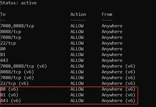 Nginx Proxy Manager requires ports 80, 81, and 443 to be accessible from the internet. In this step, you will configure the VPS firewall (UFW) and confirm the rules are applied correctly.