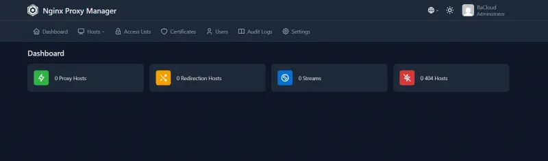 After submitting the admin account details, you will be taken directly to the Nginx Proxy Manager dashboard.