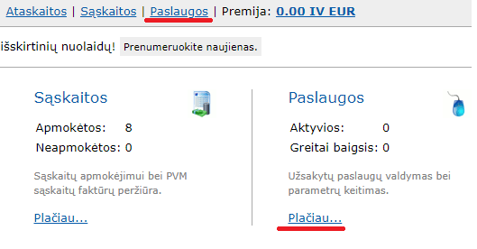 1.1 Meniu pasirinkite punktą "Paslaugos" arba skydelyje prie paslaugų paspauskite "Plačiau":