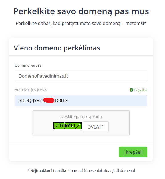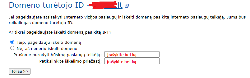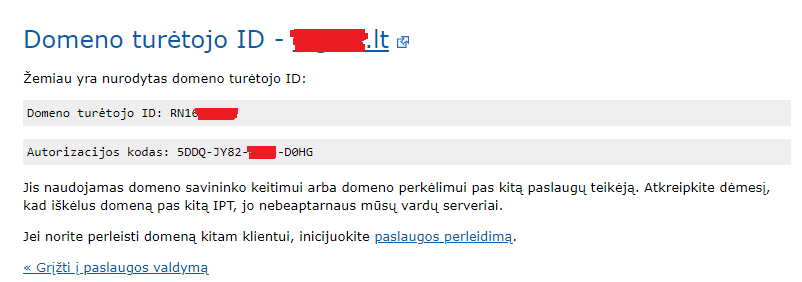 Šiuo atveju Domeno turėjojo ID Bacloud nebus reikalingas, domenas bus perkeltas naudojantis Autorizacijos kodu.