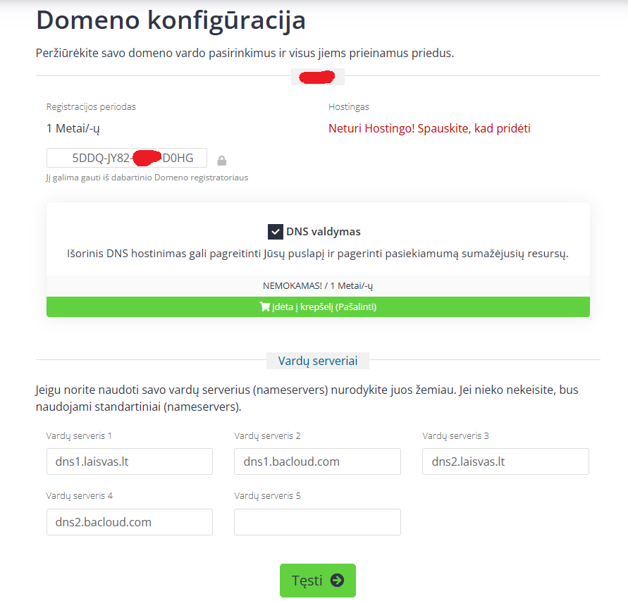 Domeno vardų serverius, jei svetainė yra talpinama ne Bacloud duomenų centre, paliekame jau dabar esančius vardųserverius. Kitu atveju gali sutrikti svetainės veikimas.