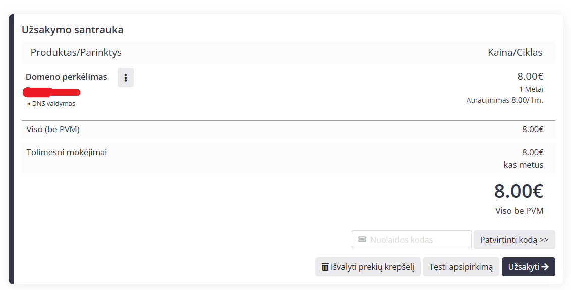 Tolesniame lange matome užsakymo santrauką. Jei nereikia atlikti jokių pakeitimų, spaudžiame "Užsakyti".