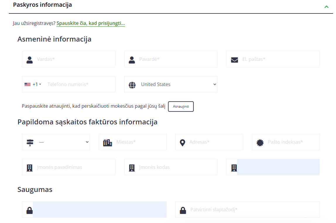 Sekančiame lange reikalinga registracija arba prisijungimas prie vartotojo.
