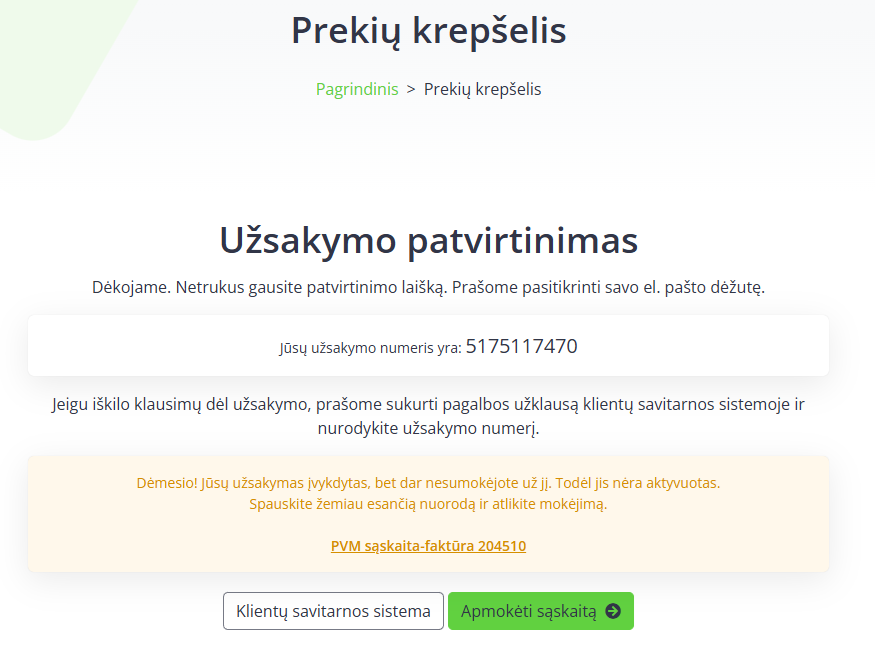 Užpildžius duomenis arba prisiregistravus, užbaikite užsakymą. Jūsų užsakymas patvirtintas. Pasirinkite "Apmokėti sąskaitą":