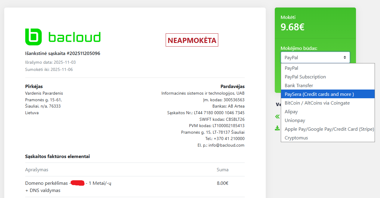 Atlikus mokėjimą, Bacloud komandos techninis skyrius atliks domeno perkėlimo procedūrą. Tai gali užtrukti nuo kelių minučių iki kelių valandų, priklausomai nuo savaitės dienos ar paros meto.