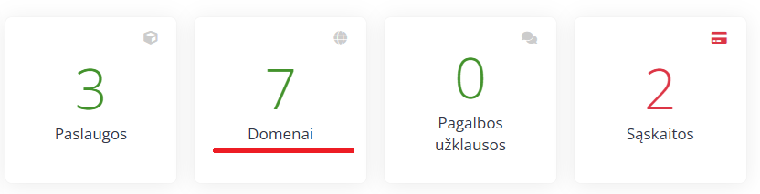 Prisijungę prie klientų zonos, pagrindiniame valdymo skydelyje suraskite savo domenus.