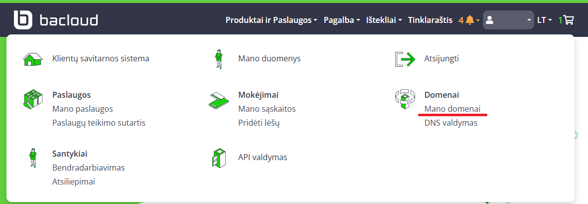 Arba viršutiniame meniu spustelėkite vartotojo piktogramą su savo vardu ir pasirinkite parinktį „Mano domenai“: