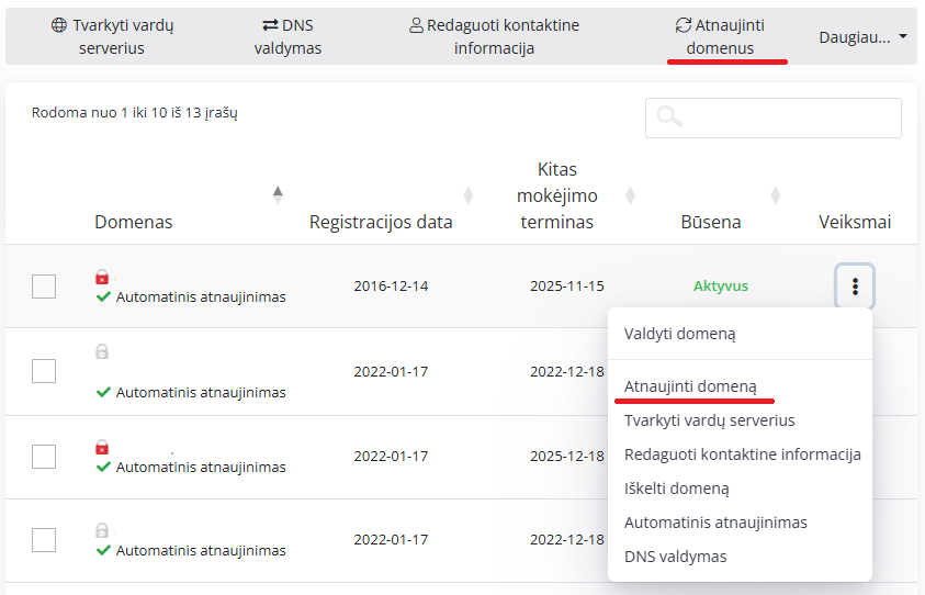 Jei norite atnaujinti daugiau nei vieną domeną, paspauskite ant juostoje esančios nuorodos "Atnaujinti domenus".