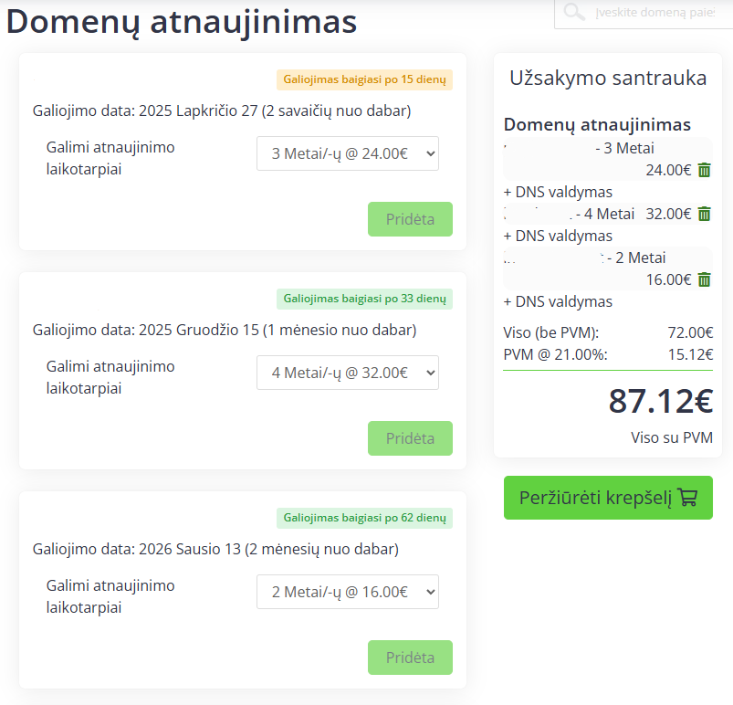 Jei norite pratęsti daugiau nei vieną domeną, galite pasirinkti kiekvieno domeno individualų pratęsimo laikotarpį ir pridėti į krepšelį.
