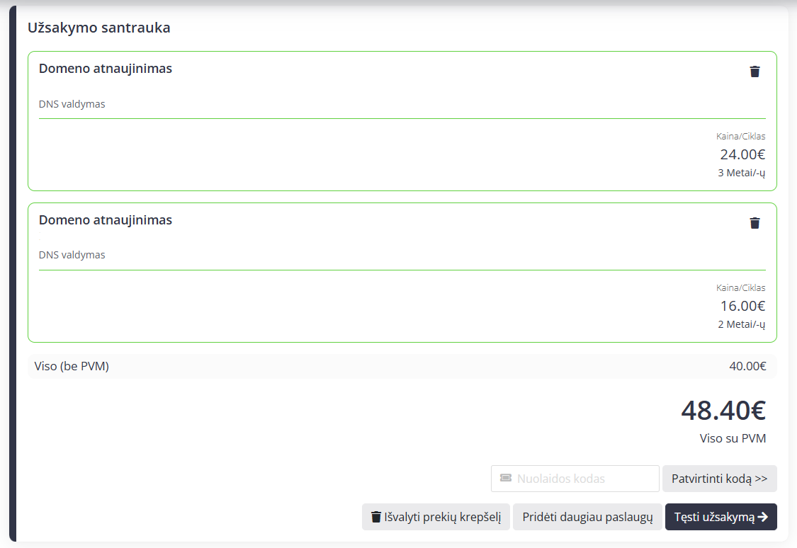 Galite tęsti apsipirkimą – pridėti daugiau domenų ar kitų paslaugų į krepšelį, kad galėtumėte apmokėti viską vienu metu, arba tęsti užsakymą vienai paslaugai ar pasirinktiems keliems domenams. Norint pašalinti domeną iš sąrašo, reikia pasirinkti šiukšlių dėžės ženklelį, esantį dešinėje pusėje.